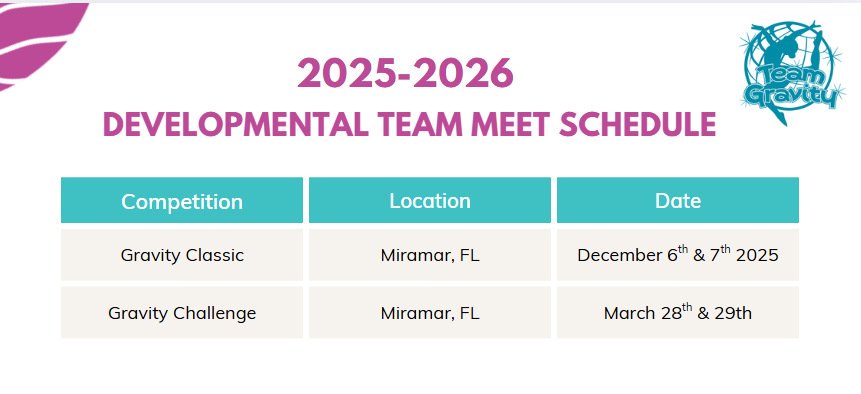 Welcome to the 2025-2026 season! We are extremely happy to have you and your daughter as part of our Gravity Developmental Team Program! We would like to take this opportunity to congratulate your daughter on her hard work. As we embark on this journey together, we are thrilled to have each of you bring your unique talents, skills, and passion to our development team. This season promises to be one of growth, achievement, and camaraderie as we work towards our common goals. Whether you are a returning member or joining us for the first time, we are excited to build upon our successes and create lasting memories. Together, let's strive for excellence, support one another, and make this season truly remarkable!